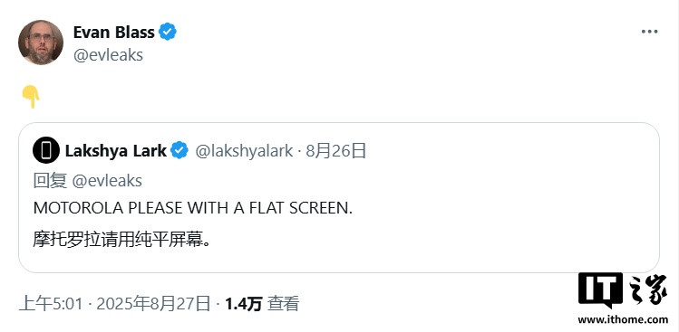 Blass最新曝料称摩托罗拉Edge2026将改用平面屏设计。他先是称赞了现款Edge2025的外观,随后转发了一条建议改为平面屏的评论,这一互动被外界解读为新机设计将有所改变。