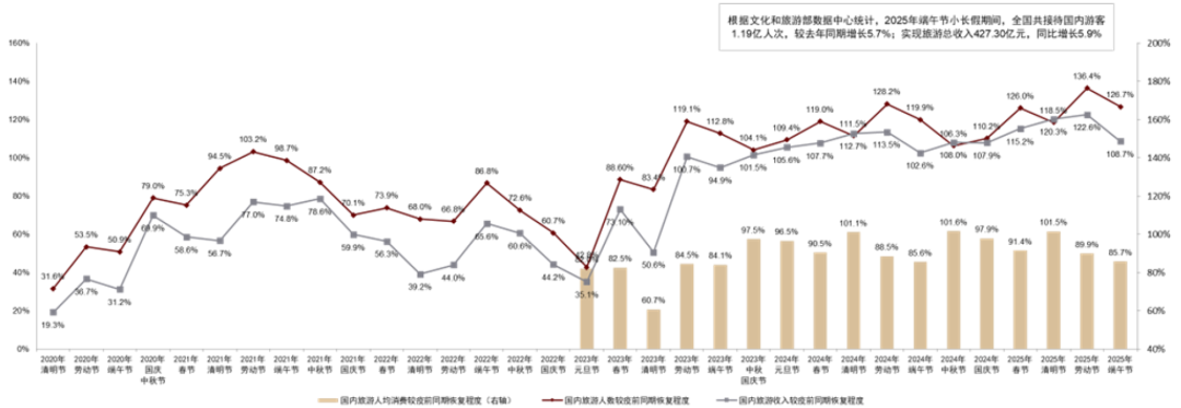 图表:2020年以来节假日国内旅游人数及收入较疫前同期恢复程度