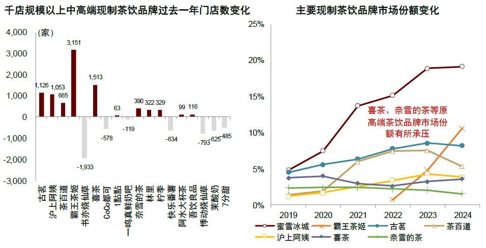 图表:中高端茶饮品牌表现分化及喜茶、奈雪份额有所承压