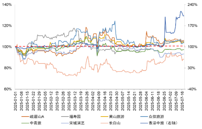 注:股价数据为2025/1/1至2025/7/18,图例按照期间涨幅由高到低排序(香港中旅为涨幅最高)