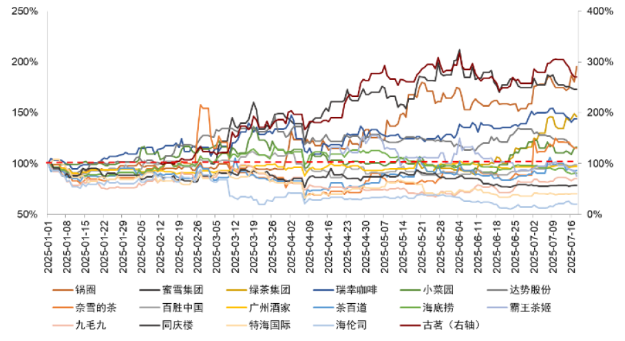 注:股价数据为2025/1/1至2025/7/18,图例按照期间涨幅由高到低排序(古茗为涨幅最高)